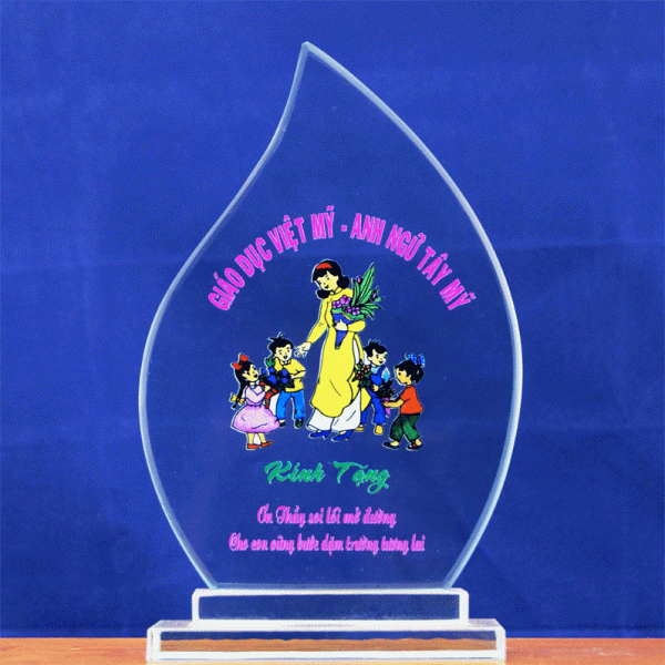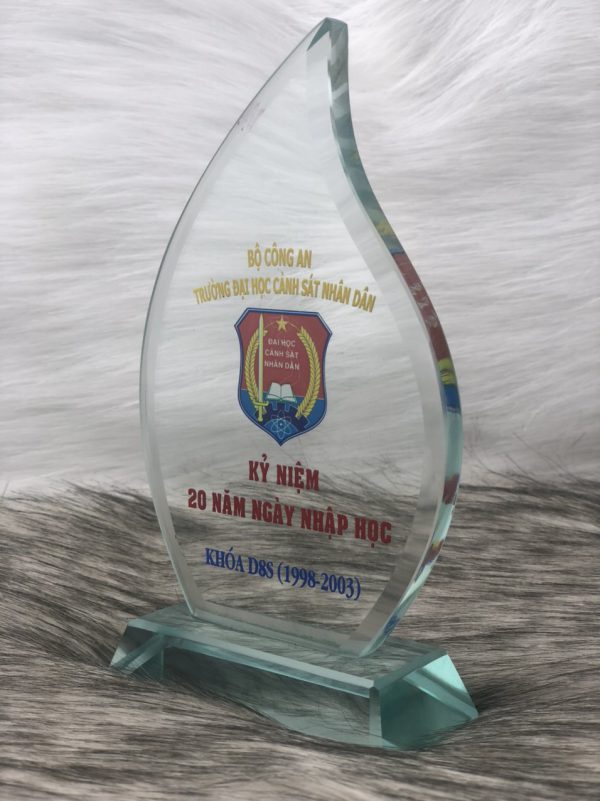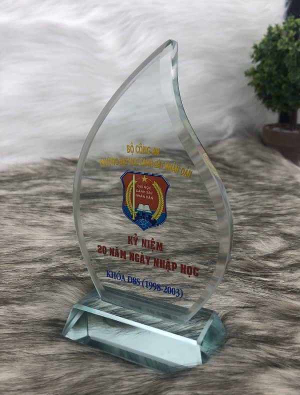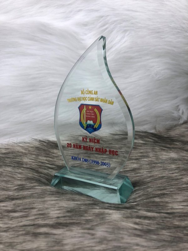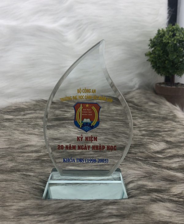 Kỷ niệm chương ngọn lữa KNCNL01 mài các cạnh lá hẹ tinh khiết , sản phẩm được trau chuốt các đường nét, đế được bố trí hai tầng, chất liệu bằng thủy tinh hoặc pha lê nhập khẩu, sản phẩm hoàn thiện bằng khắc hoặc in UV trực tiếp lên sản phản phẩm, với các đường nét sắc cạnh, sau cùng được phủ lớp chống bay màu để bảo quản trong thời gian dài, lưu niệm chương lưu giử cho chủ nhân những kỷ niệm ký ức đẹp nhấ